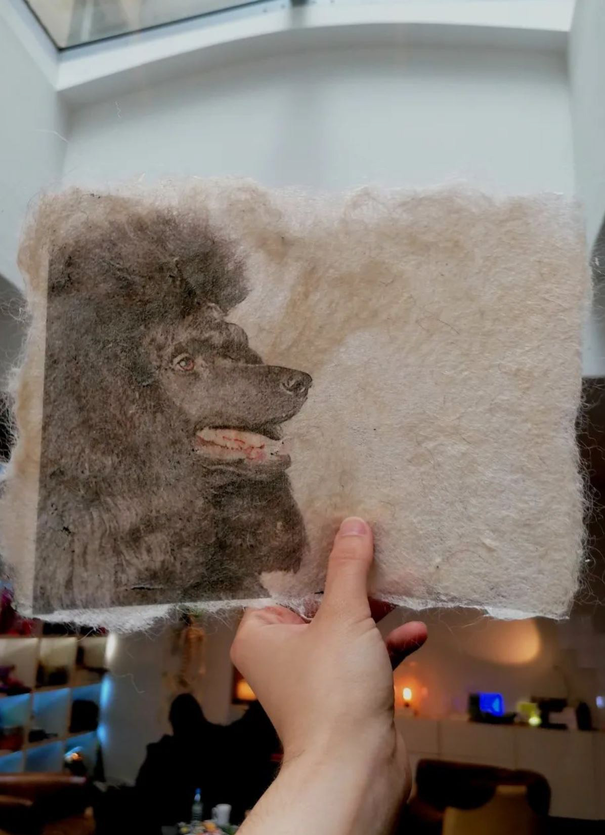 Après un an de recherches, de doutes et d’émotions — de la peine à la joie profonde —, j’ai mis au point ce matériau : un papier composé de cheveux, à la fois imprimable, pliable, raccommodable, recyclable, et capable de prendre différentes formes.