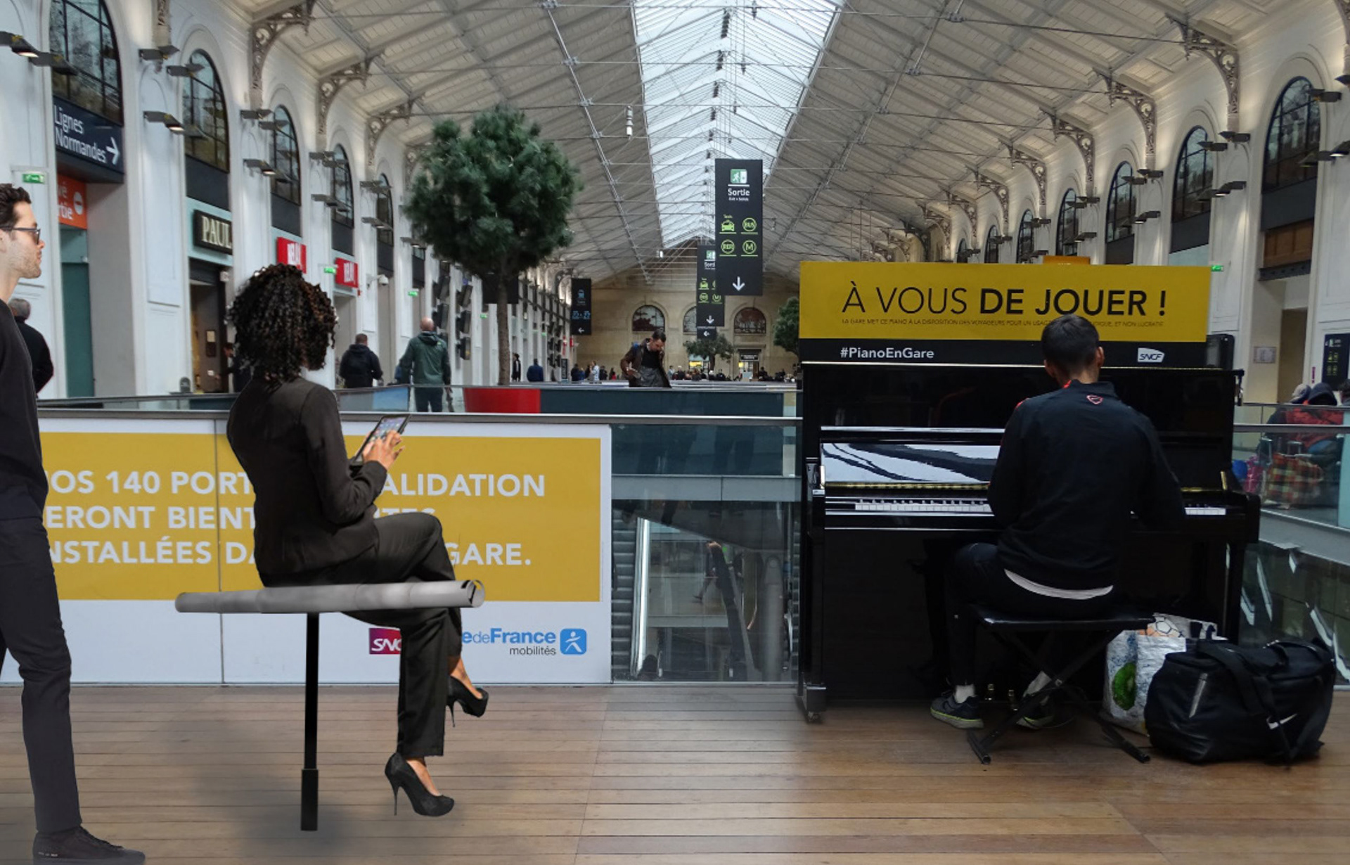 Ce projet d’assise explore la manière dont les dispositifs collectifs, en intérieur comme en extérieur, contribuent à définir un territoire partagé dans les gares.