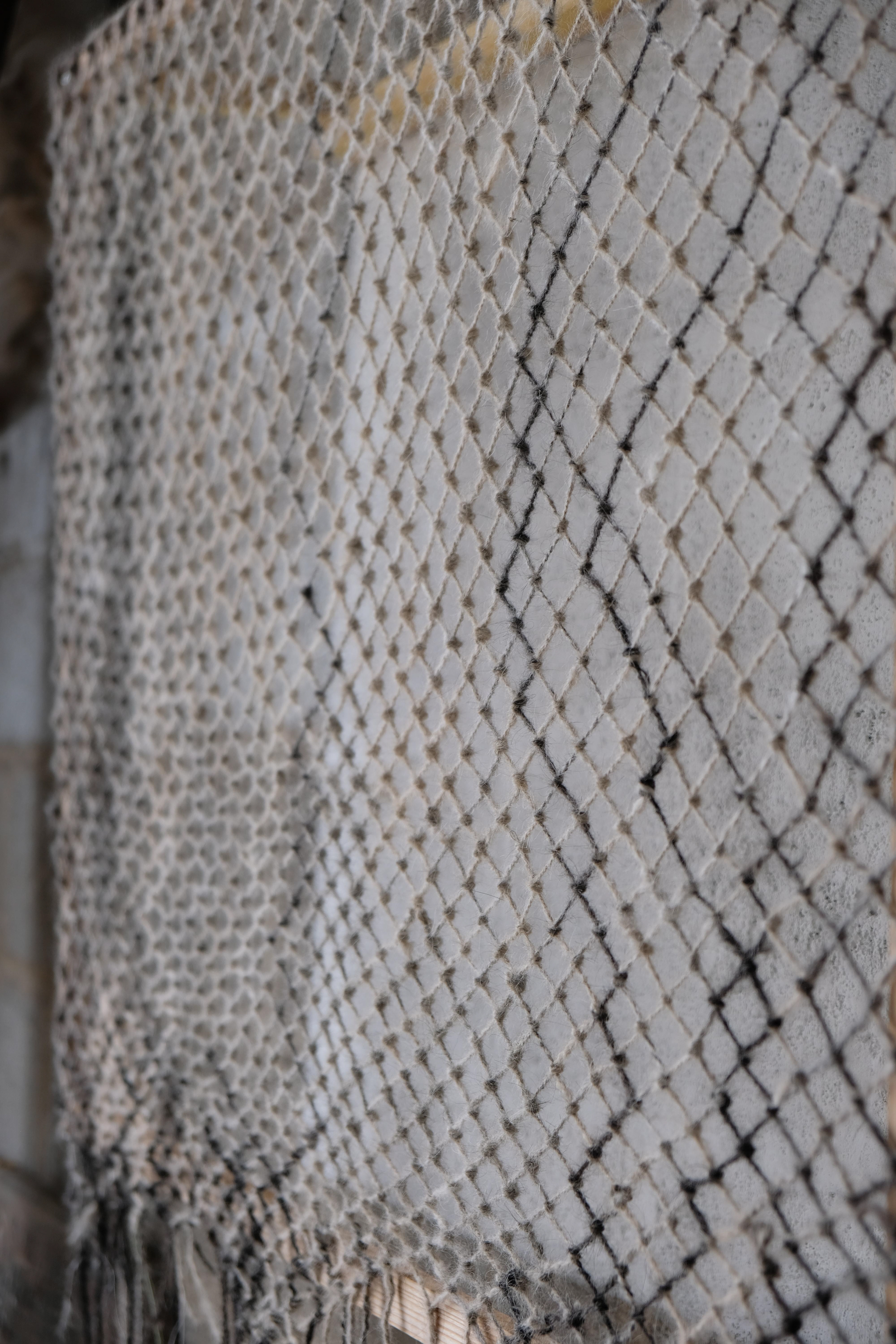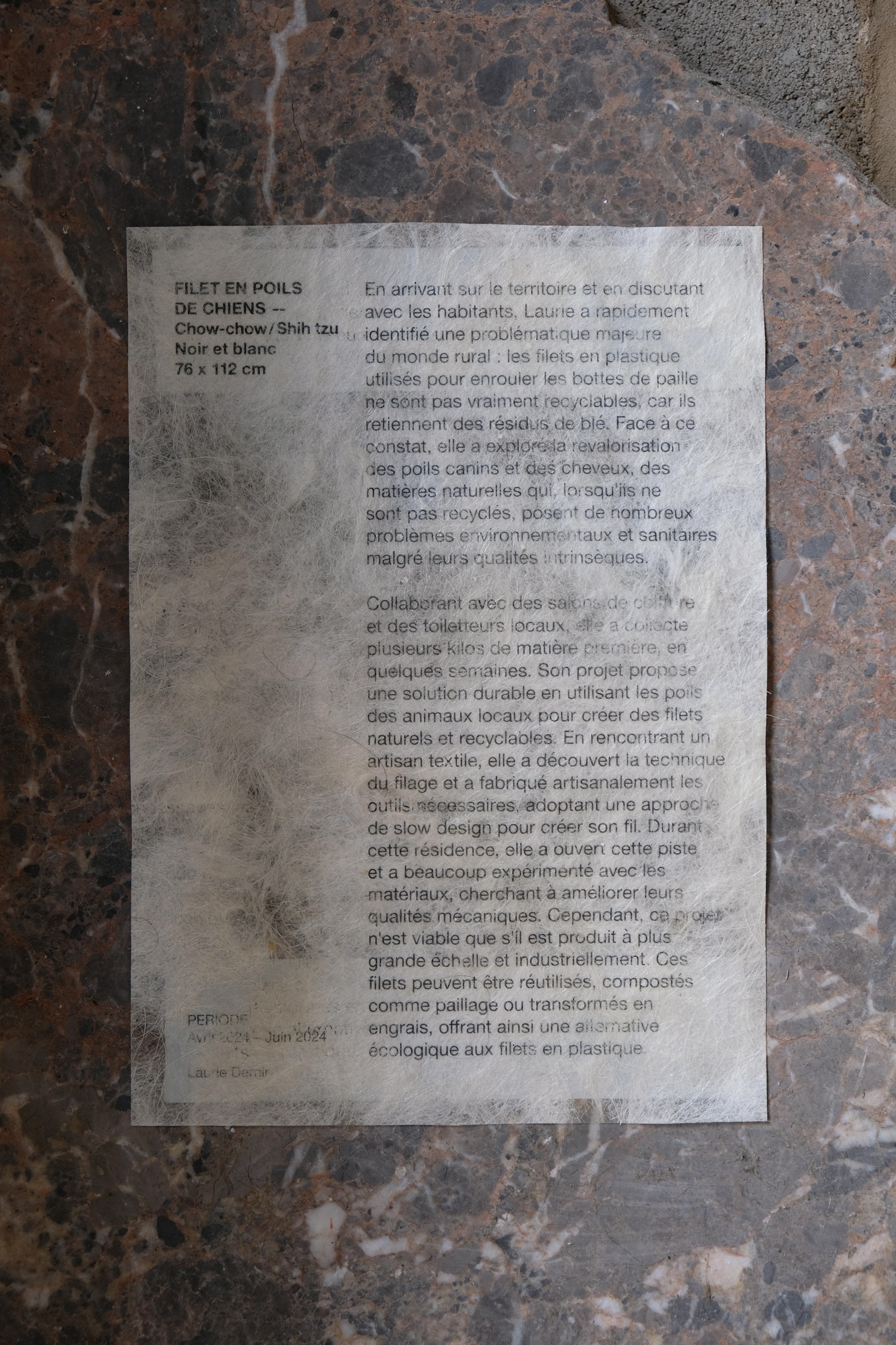 Son projet propose une solution durable en utilisant les poils des animaux locaux pour créer des filets naturels et recyclables. En rencontrant un artisan textile, elle a découvert la technique du filage et a fabriqué artisanalement les outils nécessaires, adoptant une approche de slow design pour créer son fil. Durant cette résidence, elle a ouvert cette piste et a beaucoup expérimenté avec les matériaux, cherchant à améliorer leurs qualités mécaniques. Cependant, ce projet n'est viable que s'il est produit à plus grande échelle et industriellement.